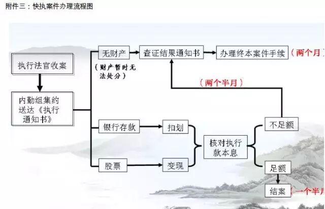 第一条【总则】为提高执行工作效率,规范执行行为,根据《中华人民共和国民事诉讼法》、最高人民法院《关于适用<中华人民共和国民事诉讼法>的解释》和《关于人民法院执行工作若干问题的规定(试行)》及相关法律法规、司法解释的有关规定,结合《深圳市中级人民法院关于推进繁简分流简案快办机制改革的指导意见》及全市两级法院执行工作实际,制定本规程。第二条【受案范围】执行案件实行繁简分流。凡符合以下条件的简单执行案件,适用快速执行程序:(一)生效法律文书不具有强制执行内容,可驳回强制执行申请的;(二)可通过向有关单位发送协助执行通知书办结的行为执行案件;(三)标的在20万元(含本数)以下,且被执行人财产线索不含机器、设备、办公用品等动产的;(四)标的在20万元以上,且被执行人财产线索为以下几种情况的:1、银行存款、股票、支付宝账户等可以足额清偿债权的;2、没有可供执行财产的,其中包括有财产但暂时不能处分的;3、根据被执行人财产查询情况可以判断案件具有和解可能的。第三条【执行团队】执行局及派出法庭应组建快执团队负责简单案件的快速执行,团队由执行长(审判长)、执行员、法官助理、法警等按照一定比例组成。第四条【“五查”前置】快速执行案件立案后,由立案庭在综合业务系统上提取被执行人身份信息,向鹰眼查控网批量提起财产查询。第五条【分案】“五查”结果反馈后,由人工或电脑系统识别快执程序案件,并进行随机分配。第六条【签收与退回】快执案件分配到承办人名下后,须于两日内签收,凡认为不符合快执程序条件的,须于五日内退回。不符合快执程序退回的案件,由分案人员在电脑上重新按照普通案件进行分配。第七条【控制财产】快执程序案件签收后,有可供执行财产的,应首先安排控制财产,避免被执行人转移财产。第八条【集约送达】无财产案件及已办妥控制财产手续的案件交专人在三个工作日内制作并集约送达《执行通知书》,送达完毕后,将案卷移交承办人。第九条【调查】办妥以上手续后,快执案件承办人应在五个工作日内联系申请执行人和被执行人,并视情况制作调查笔录。第十条【应告知申请人的事项】联系申请执行人应告知以下事项:(三)要求申请执行人提供被执行人的财产和人员下落的相关线索。第十一条【应告知被执行人的事项】联系被执行人应告知以下事项:第十二条【财产处分】被执行人未按照执行通知书的要求履行义务的,承办法官区别被执行人财产情况进行处理:(一)被执行人银行存款足额可供执行的,扣划存款后,将款项划付给申请执行人并办理执行完毕的结案手续;(二)被执行人持有的股票足额可供执行的,股票变现后,将款项划付给申请执行人并办理执行完毕的结案手续;(三)被执行人主动履行或双方当事人和解并履行完毕的,由申请执行人出具结案申请后办理执行完毕的结案手续;(四)双方当事人达成分期履行和解协议,且履行期限在三个月以上的,由申请执行人出具书面申请,办理终结本次执行程序的结案手续。(五)被执行人无可供执行的财产,或银行存款、股票等处分完毕仍不足以清偿全部债务,且无其他可供执行财产的,办理终结本次执行程序的结案手续。第十三条【结案手续】执行完毕的快执案件应以裁定方式结案。结案裁定应写明执行过程、执行完毕的金额以及解除对被执行人财产的控制措施等内容。第十四条【终本审批】终结本次执行程序的快执案件应以裁定方式结案,并按照《深圳市中级人民法院关于规范以终结本次执行程序方式结案的规定》办理相关审批手续。第十五条【特殊案件的移交】快执程序案件在执行过程中出现有房产、车辆等财产可供执行情况的,快执法官须提交变更承办人申请报处领导(执行长)审批,移交普通执行法官按照普通程序办理。第十六条【结案期限】快执程序案件应在承办法官收案后两个月内办理结案手续,特殊情况报请处长(执行长)同意,可延长一个月。第十七条【解释主体】本规程由深圳市中级人民法院审判委员会负责解释。