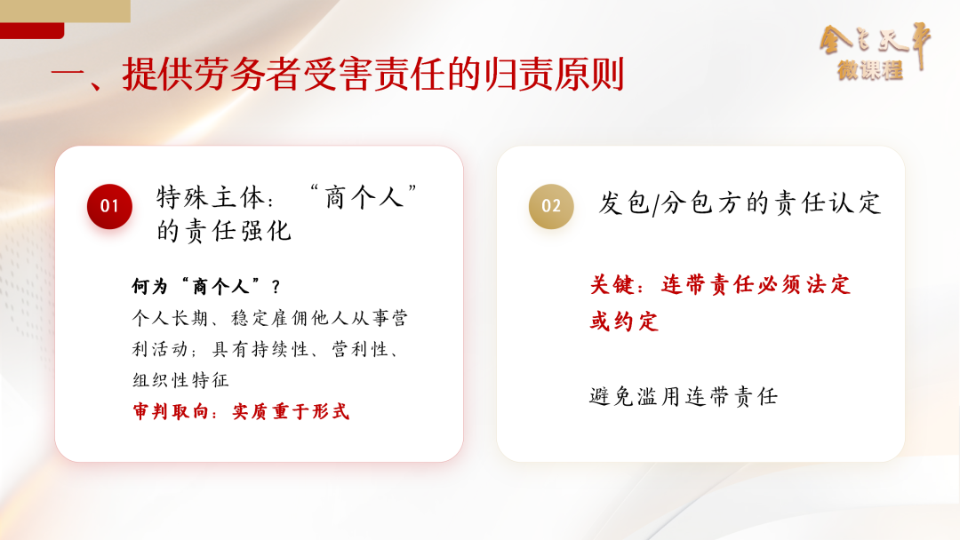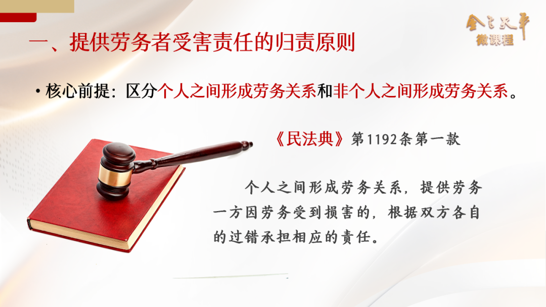 杜凤君:确实如此。归责原则呢,是这类案件的核心难点。那么民法典第1192条规定,在个人之间形成劳务关系的情形下,提供劳务一方因劳务受到损害,按照过错责任原则处理。这与此前2003 年最高院人身损害司法解释第11条规定的雇主无过错责任有着明显的变化。
