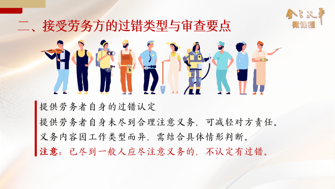 王韶婧:除此之外,提供劳务者自身的注意义务也不容忽视。提供劳务者在从事劳务活动过程中对行为方式的错误选择、对劳动安全条件的放弃或者是漠视、对安全事故的防范注意程度低于了一般标准等情形,都应当认定其自身是有过错的。如果提供劳务者已经尽到了一般人通常情况下应尽的注意义务,那么就不能认定他具有过错而减轻接受劳务方的责任。在不同类型的劳务作业当中,上述义务的内容和体现方式并不完全一致,需要结合具体的情形来加以认定。