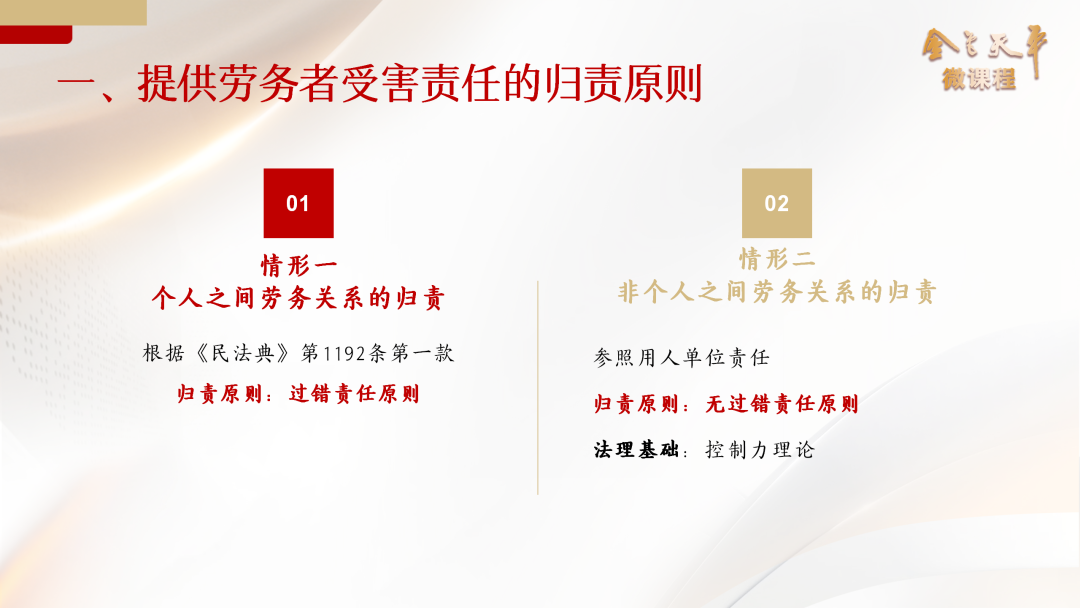 杜凤君:的确。第一种情形已有法律的明文规定,那么对于第二种情形,个人与用人单位之间形成劳务关系时的归责原则,存在两种观点:一种观点呢,认为应适用侵权责任的一般归责原则,也就是过错责任原则;或者参照民法典第1192条,由用人单位承担过错责任。另一种观点呢,则认为应当参照劳动关系,适用无过错责任原则。