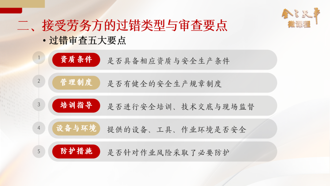 ➣ 第二是管理制度与现场监督方面。对于个人接受劳务者,那么我们主要审查他是否对作业现场进行了合理的监督与协调;对于发包分包单位而言,那么需要审查他是否对承包方的施工现场有必要的安全监督制度或者检查,否则很可能构成定作、指示方面的过错。